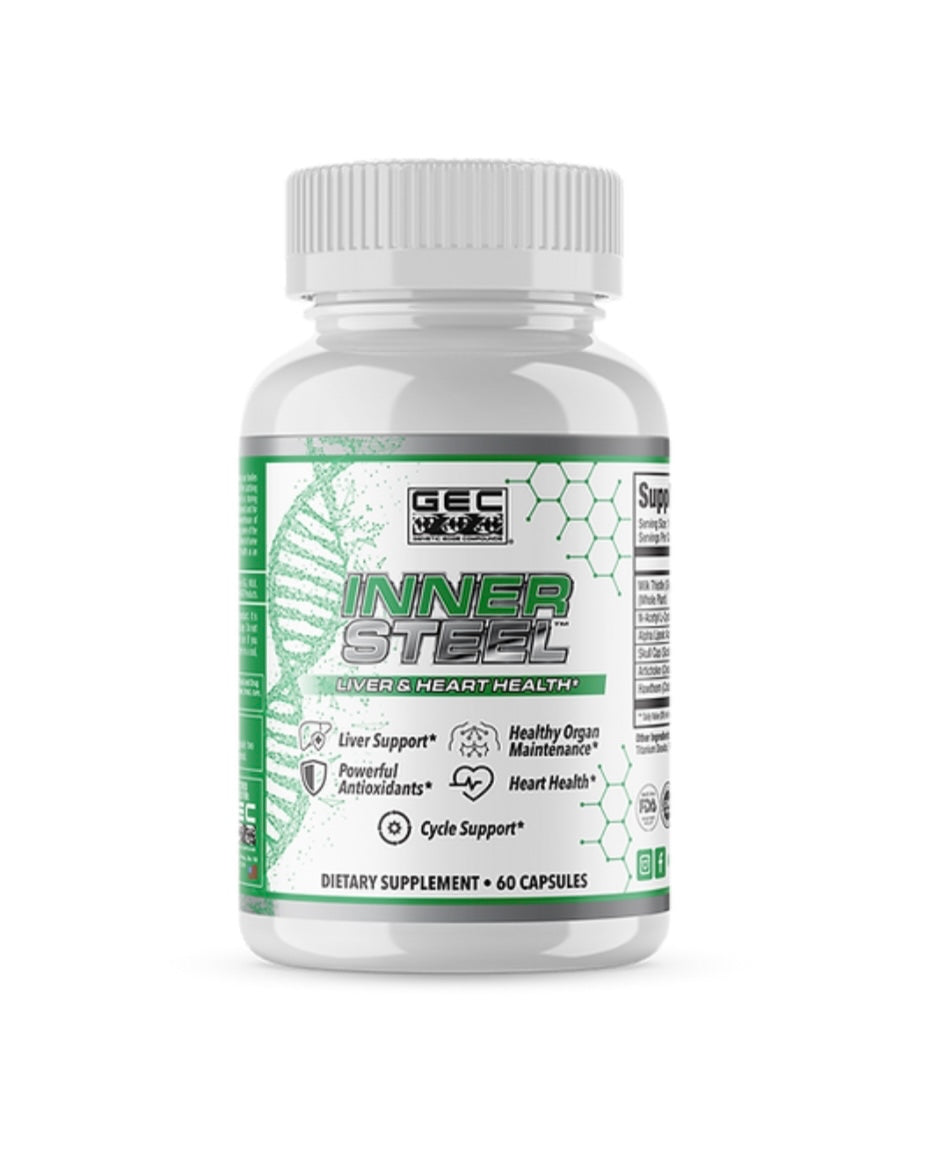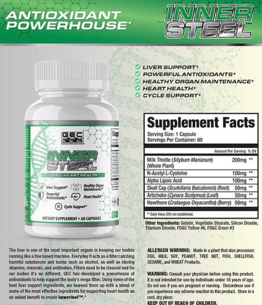 Innersteel is the powerhouse of antioxidants. Using some of the best ingredients for liver support and heart health, GEC combined 6 highly effective ingredients for the ultimate detox. This superblend contains 3 antioxidants for healthy liver maintenance and 3 heart health ingredients to promote healthy organ function and cycle support. Milk Thistle, NAC, and ALA promote liver health, support for the body's natural detox properties, and recycle the body's antioxidants. Artichoke, Skull Cap, and Hawthorne berry aid in helping to maintain healthy heart function, blood pressure, and cholesterol for a healthier heart and kidneys already within normal range. Innersteel is a great stand alone for overall health or to accompany other products to aid in organ stress.